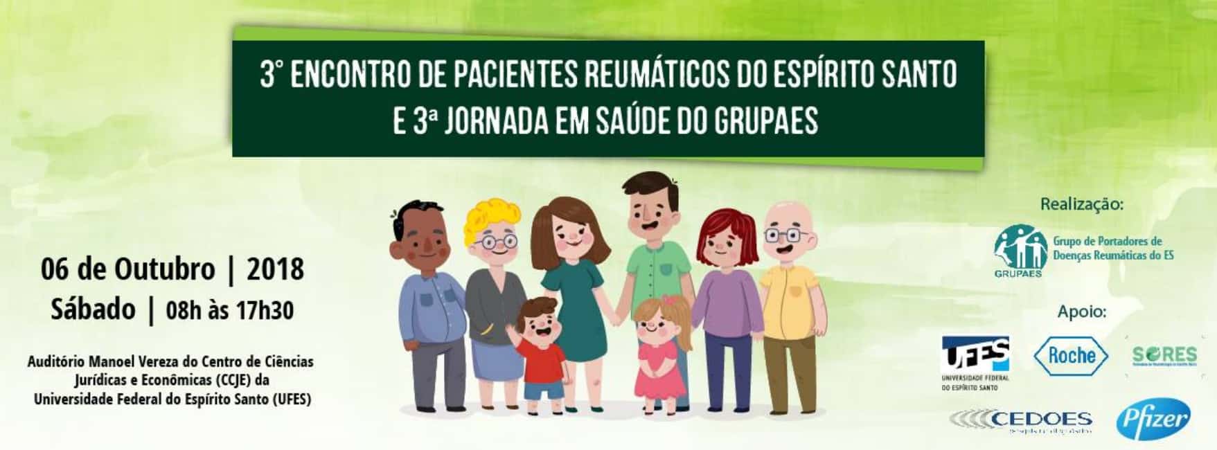 Inscrições: https://www.sympla.com.br/3-encontro-de-pacientes-reumaticos-do-espirito-santo-3-jornada-em-saude-do-grupaes__351673