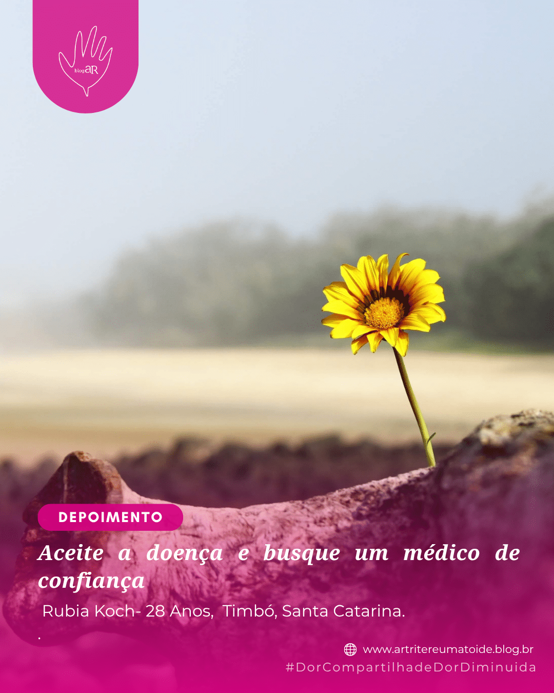 Meu nome é Rubia Koch @rubiakbonin, tenho 28 anos, convivo com o diagnóstico de artrite reumatoide desde os 26 anos, sou Técnica em Vigilância Sanitária e moro em Timbó, Santa Catarina.
