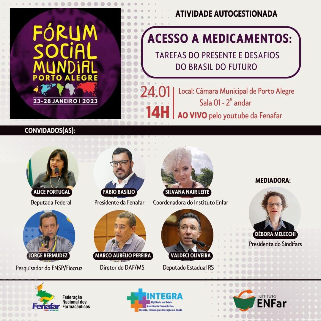 A atividade autogestionada, durante o Fórum Social Mundial que ocorre em Porto Alegre/RS, é promovida pela Federação Nacional dos Farmacêuticos (Fenafar) pelo Instituto Escola Nacional dos Farmacêuticos (Enfar) e Projeto Integra.