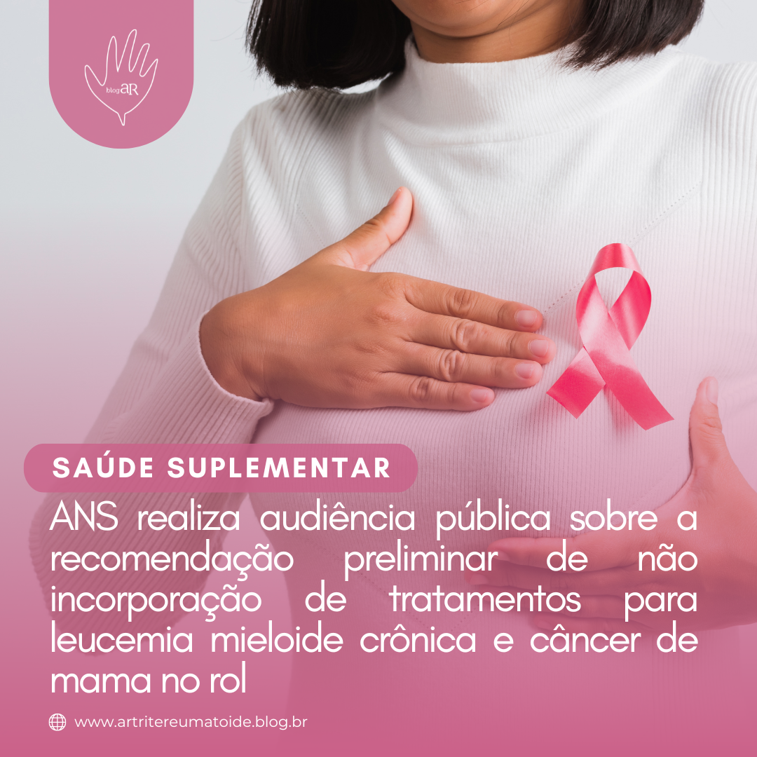 A Agência Nacional de Saúde Suplementar (ANS) realizou nesta terça-feira (16), audiência pública para a coleta de contribuições sobre a recomendação preliminar de não incorporação de tecnologias para o tratamento de leucemia mieloide crônica e câncer de mama no rol da agência.