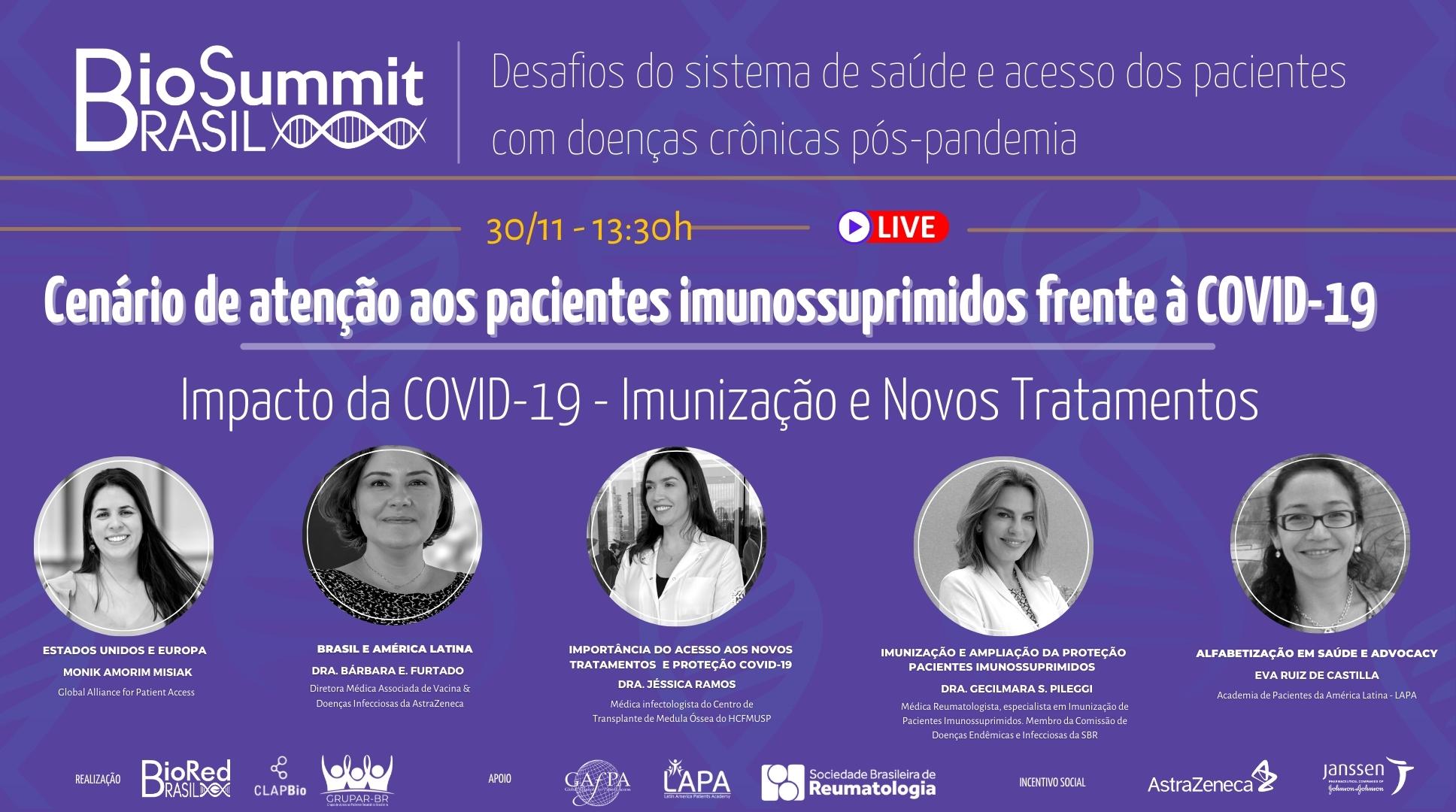 Biored Brasil e o Centro Latino Americano de Pesquisa em Biológicos “Clapbio”, realiza entre os dias 29 e 30 de novembro de 2022, a 3º edição do Webinário BioSummit Brasil, que apresentará aos pacientes, profissionais de saúde e toda a sociedade civil, informações sobre as terapias imunobiológicas e os mais diversos desafios do sistema de saúde pública e privada de acesso a estes medicamentos, que representam uma grande inovação no tratamento de doenças crônicas e imunomediadas. Iniciativa que conta com o apoio institucional da Sociedade Brasileira de Reumatologia, da Aliança Global para o Acesso do Paciente (GAFPA) e da Academia de Pacientes da América Latina (LAPA). Seguindo o código de conduta da Interfarma, Biossumit Brasil recebe incentivo social da Astrazeneca do Brasil e Janssen Cilag.