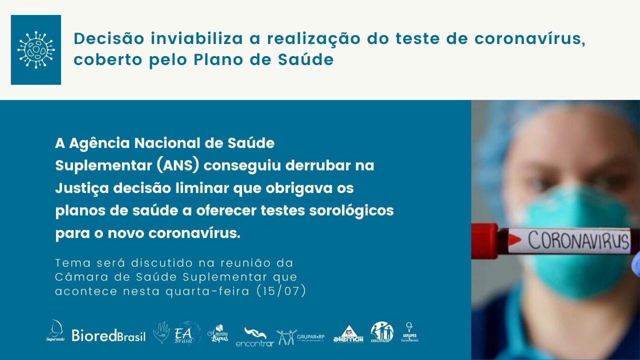 A Agência Nacional de Saúde Suplementar (ANS) informa que foi proferida decisão, em sede de agravo de instrumento, suspendendo os efeitos da medida cautelar proferida na ação civil pública que determinou a inclusão dos testes sorológicos que detectam a presença de anticorpos produzidos pelo organismo após exposição ao Coronavírus no Rol de Procedimentos e Eventos em Saúde.