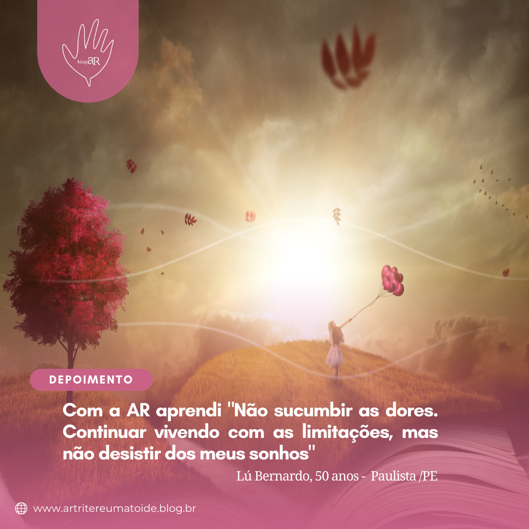 Me chamo Lú Bernardo, tenho 50 anos, sou Eng. Florestal e de Segurança do Trabalho, convivo com diagnóstico de AR há 28 anos e moro em Paulista-PE.