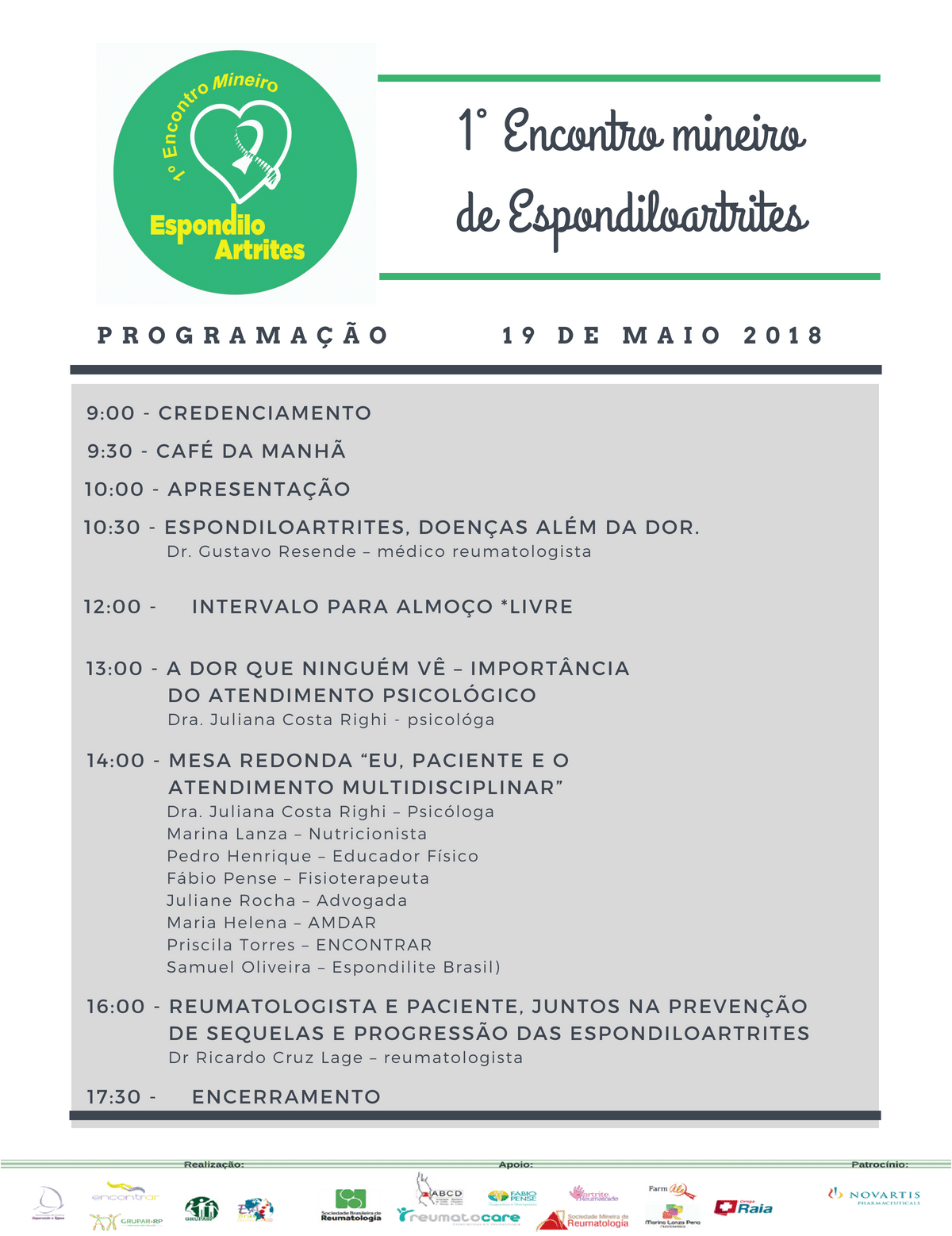Alusivo ao Dia Mundial de Conscientização das Espondilite Anquilosante, o 1º Encontro Mineiro de EspondiloArtrites, acontece em Belo Horizonte – MG, no dia 19 de maio de 2018, das 10:00 h. às 17:00 horas.