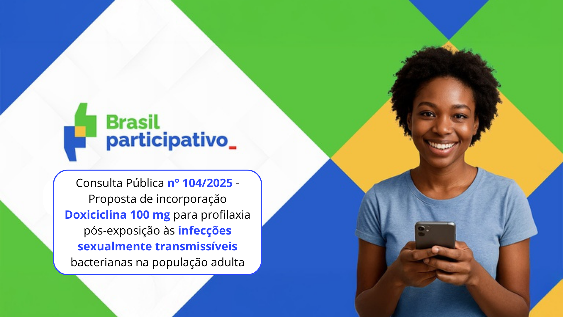A Consulta Pública nº 104/2025 está aberta até o dia 19 de janeiro para receber contribuições da sociedade (opiniões, sugestões e críticas) sobre a incorporação do Doxiciclina 100 mg para profilaxia pós-exposição às infecções sexualmente transmissíveis bacterianas (clamídia e sífilis) na população adulta