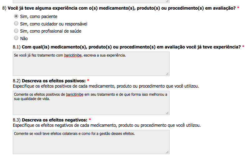 Questão 8: Nessa questão você deve responder sim, apenas se já fez uso de Baricitinibe que é o medicamento objeto desta consulta pública.