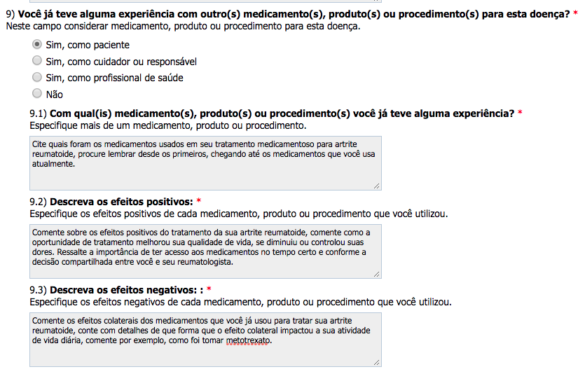 Questão 9: Como paciente com artrite reumatoide, ou familiar de paciente ou profissional de saúde, se você já está em tratamento da artrite reumatoide e já fez uso de algum medicamento para o tratamento da artrite reumatoide, click em SIM e será aberto uma tela para explicar a sua experiência. Este é o campo mais importante da consulta pública. Escreva com base em sua experiência de vida, como foi é hoje, como foi no passado a sua jornada de tratamento medicamentoso da artrite reumatoide.