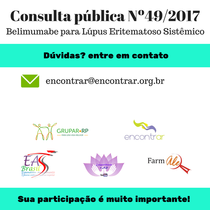 A CONITEC abriu hoje dia 22 de setembro de 2017 a consulta pública nº 49/2017 que tem por objetivo incorporar e fornecer no SUS o Belimumabe (Benlysta®). A CONITEC informou que não recomenda preliminarmente a incorporação no SUS do Belimumabe (Benlysta®) para pacientes com LES com mais de 18 anos que não responderam a terapia padrão conforme previsto no PCDT de LES excetuando-se os pacientes com nefrite lúpica ativa grave ou com lúpus ativo grave do sistema nervoso central.