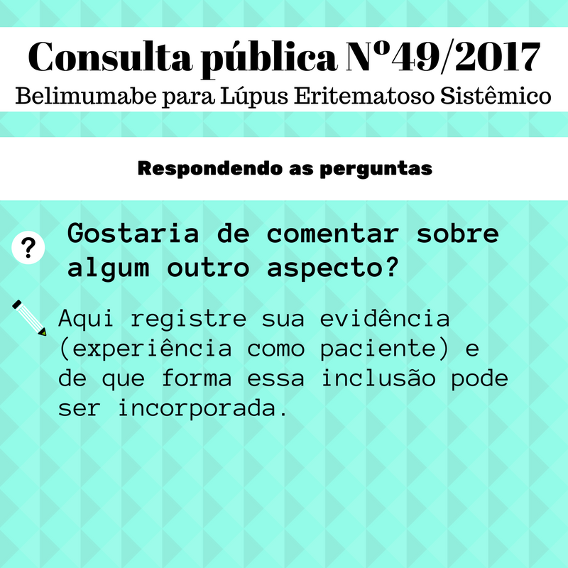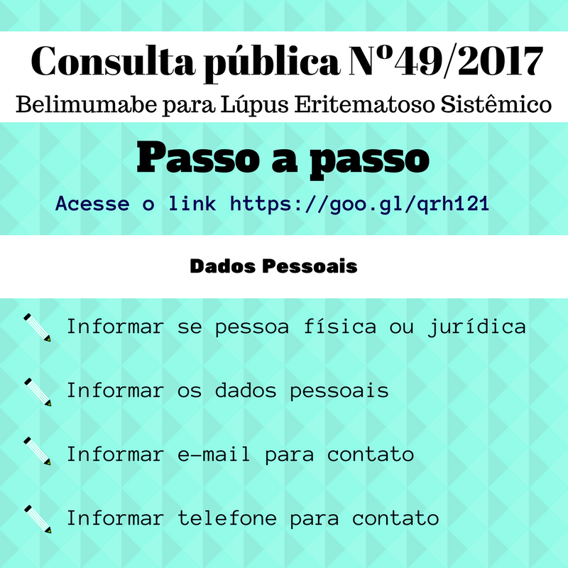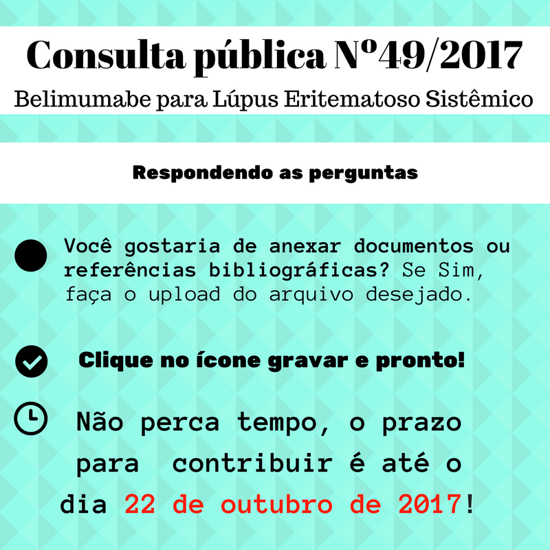 ► Contribuição técnica-científica: evidência científica – Contribuindo com análise médica da consulta pública, enviando documentos e artigos científicos que provem a eficácia, segurança e custo-efetividade Belimumabe (Benlysta®) com base em evidências científicas, este tipo de contribuição é voltada para associação de pacientes através do conselho cientifico, médicos e profissionais da saúde. Para participar preencha o relatório técnico, disponível no link: https://goo.gl/YEEp3f