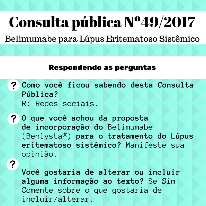 A CONITEC abriu hoje dia 22 de setembro de 2017 a consulta pública nº 49/2017 que tem por objetivo incorporar e fornecer no SUS o Belimumabe (Benlysta®). A CONITEC informou que não recomenda preliminarmente a incorporação no SUS do Belimumabe (Benlysta®) para pacientes com LES com mais de 18 anos que não responderam a terapia padrão conforme previsto no PCDT de LES excetuando-se os pacientes com nefrite lúpica ativa grave ou com lúpus ativo grave do sistema nervoso central.