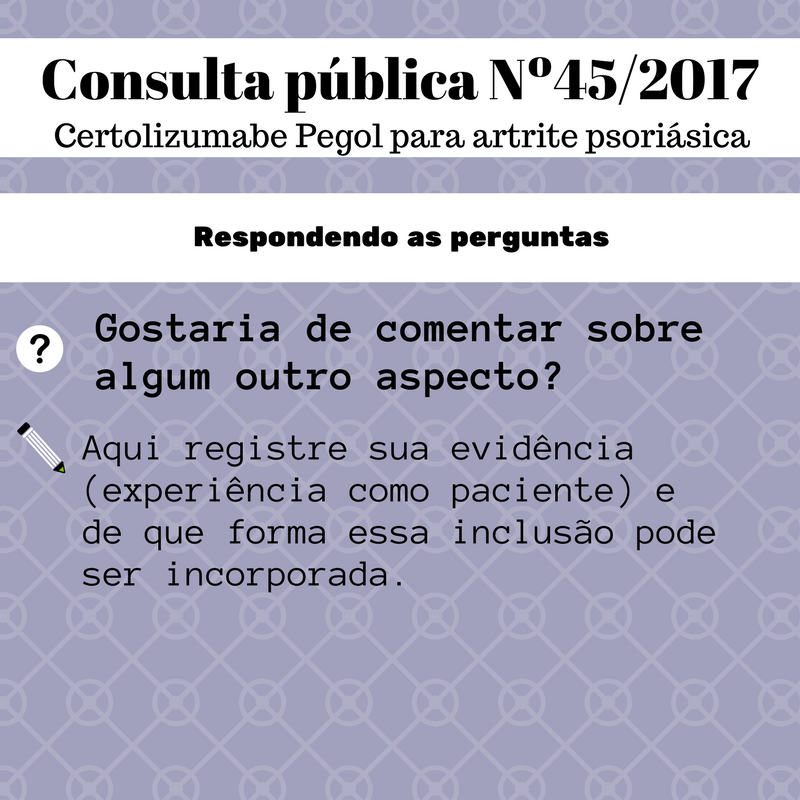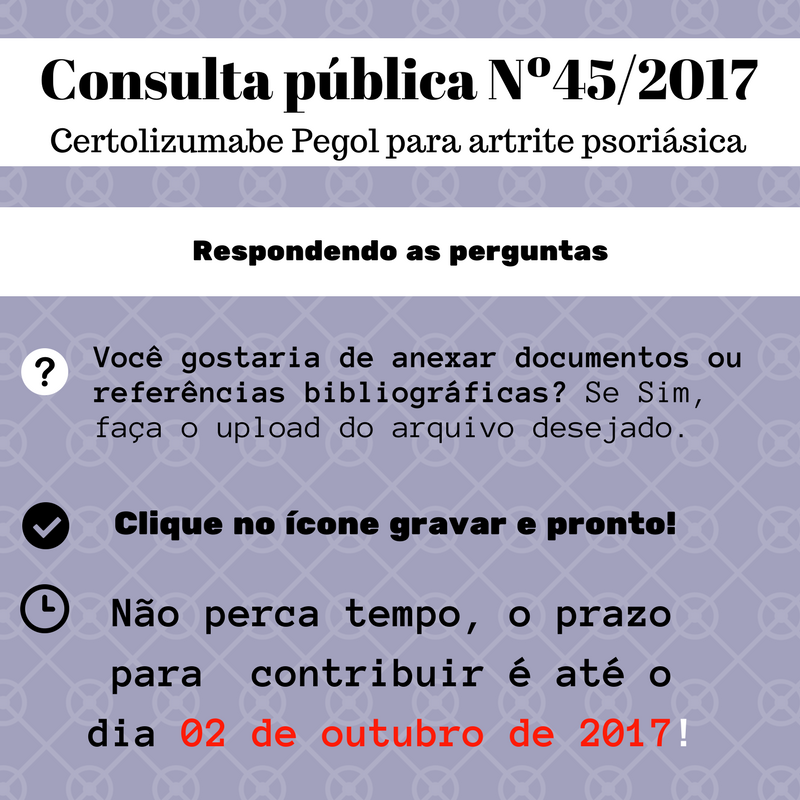 ► Contribuição técnica-científica: evidência científica – Contribuindo com análise médica da consulta pública, enviando documentos e artigos científicos que provem a eficácia, segurança e custo-efetividade Certolizumabe Pegol CIMZIA® com base em evidências científicas, este tipo de contribuição é voltada para associação de pacientes através do conselho cientifico, médicos e profissionais da saúde. Para participar preencha o relatório técnico, disponível no link: https://goo.gl/X3WGDe