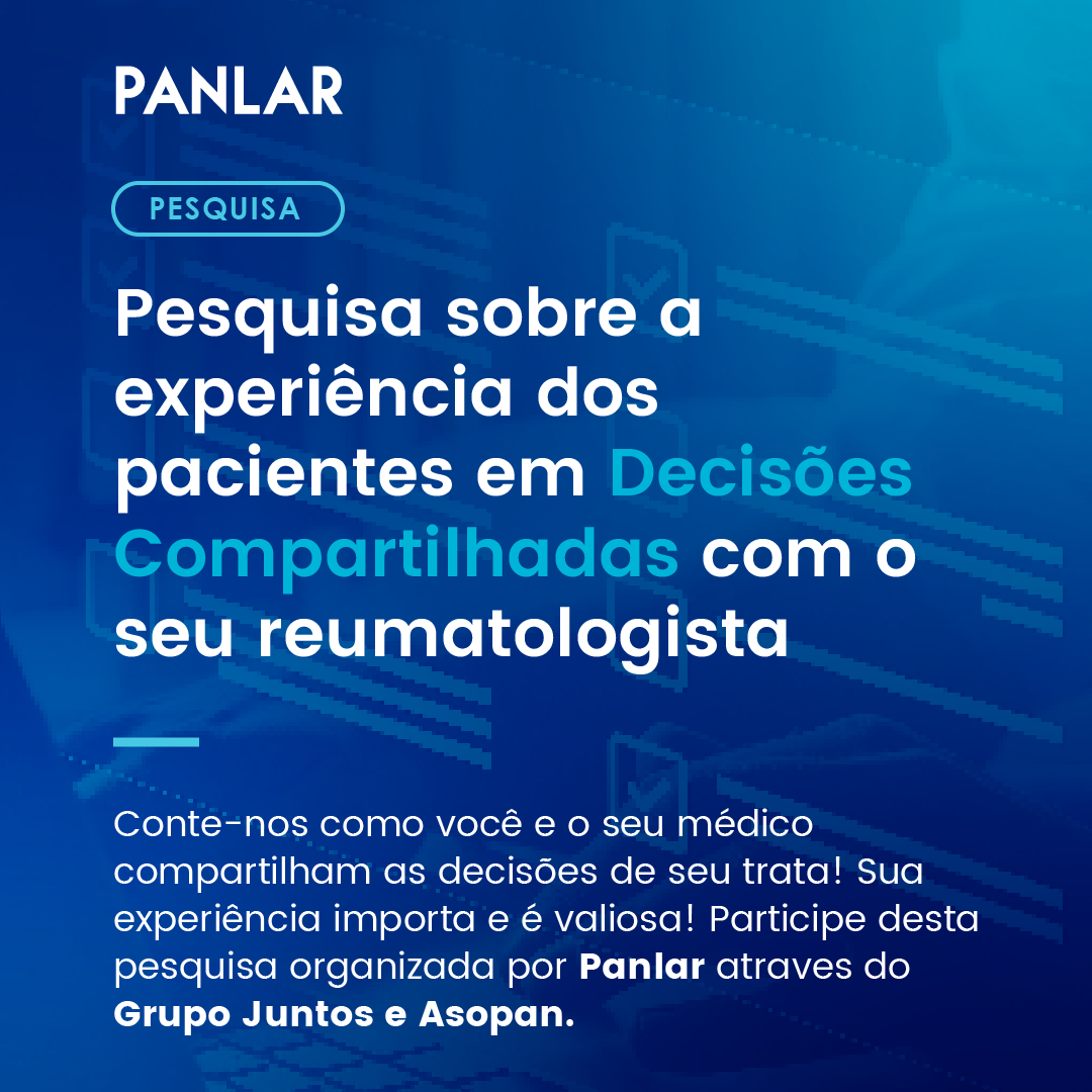 Convidamos os pacientes reumáticos para participarem desta pesquisa que busca conhecer a experiência das decisões compartilhadas com o seu reumatologista. Iniciativa organizada pela Liga Pan-Americana de Associações de Reumatologia (PANLAR), o grupo JUNTOS, com o apoio da Rede Panamericana de Associações de Pacientes Reumáticos (ASOPAN).