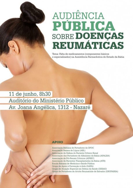 Falta de Medicamentos de Alto Custo na Bahia, é o tema da audiência pública que acontecerá, nessa quarta-feira, 11 de Junho/2014 o Ministério Público da Bahia, receberá a sociedade civil para debater a falta de medicamentos de alto custo na Bahia. Para que essa ação tenha força, é necessário a participação dos pacientes com doenças reumáticas da Bahia.
