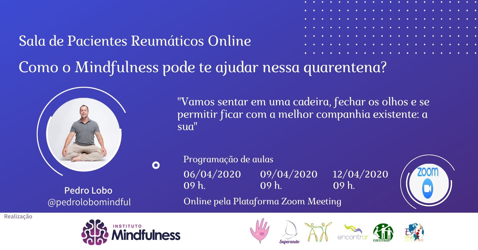 Em Parceria com o Instituto Mindfulness de Brasília, o instrutor certificado pela Universidade de San Diego (CA), Pedro Lobo ensinará aos pacientes reumáticos técnicas de meditação alinhadas a treinamentos mindfulness, totalmente gratuito em 3 aulas online, com duração de 1 hora cada aula.