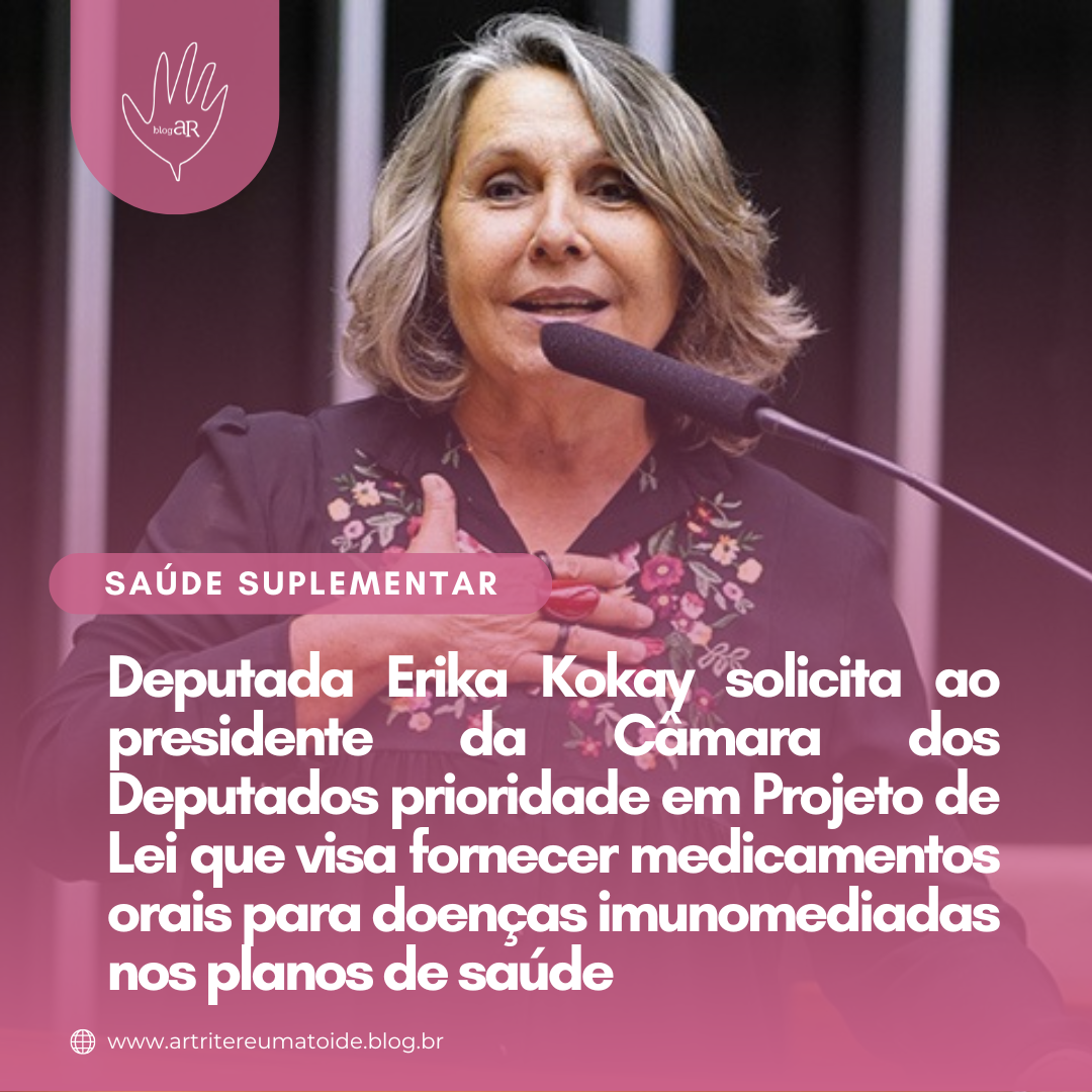 Deputada Erika Kokay, autora do Projeto de Lei (PL) nº 4871/2023, solicita ao presidente da Câmara dos Deputados a desapensação do PL para que possa tramitar separado dos outros PLs que solicitam novas coberturas no plano de saúde. O PL nº 4871/2023 prevê a alteração da Lei nº 9.656, para que possa ser incorporado como cobertura mínima obrigatória no plano de saúde o fornecimento de medicamentos orais alvos específicos para o tratamento de doenças imunomediadas no plano de saúde.