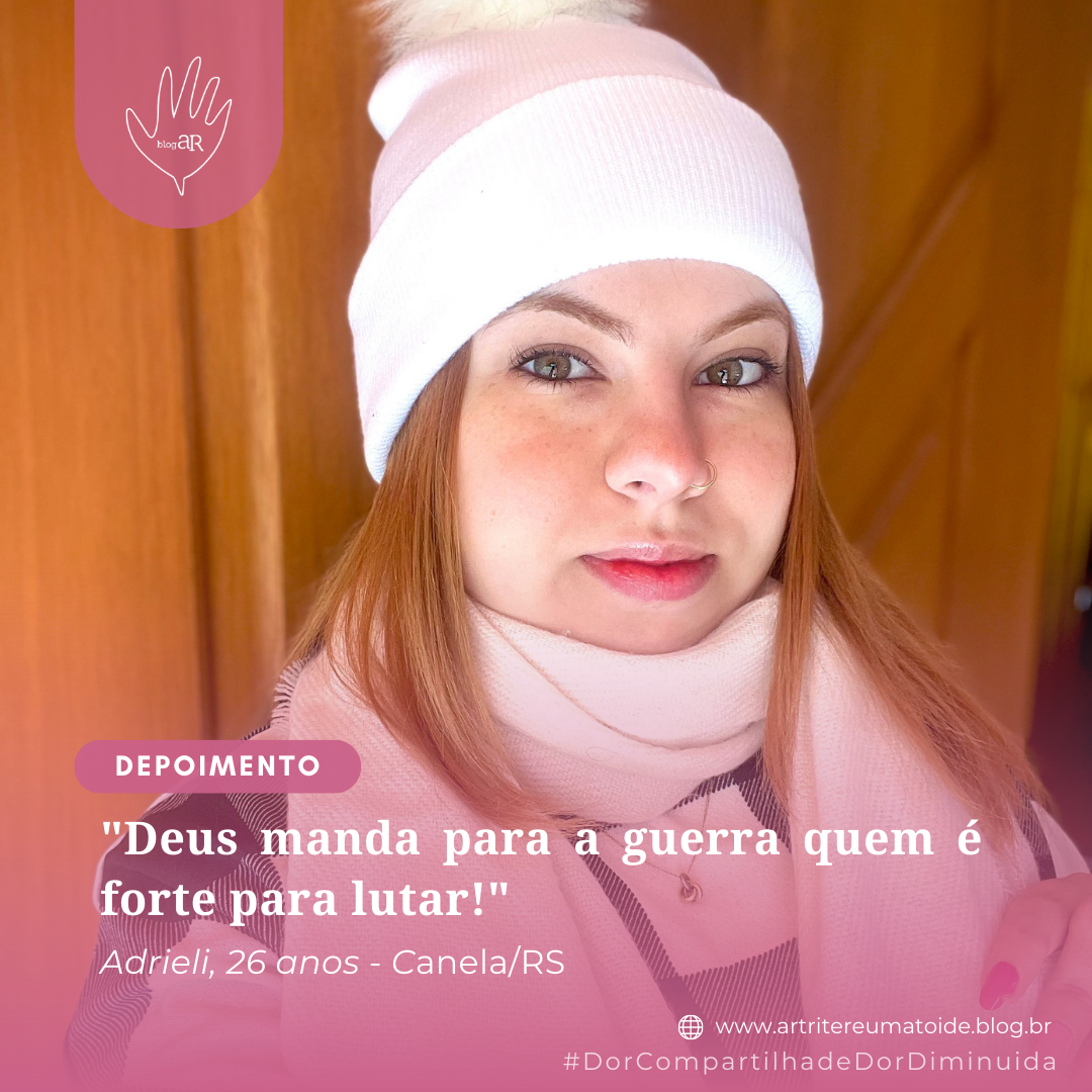 Meu nome é Adrieli, tenho 26 anos, convivo com o diagnóstico de Artrite Reumatoide à 23 anos, sou técnica em enfermagem e moro em Canela no estado do RS.