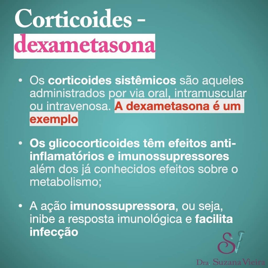 “A dexametasona é um medicamento do grupo dos glicocorticoides. Sua aplicação clínica é frequente, principalmente pelos efeitos anti-inflamatórios. Porém, além destes, sua ação glicocorticoide pode provocar vários efeitos colaterais, sendo os mais comuns a elevação da glicose do sangue (“diabetes”), elevação da pressão arterial, ganho de peso, edema (“inchaço”) e, com uso prolongado, osteoporose e insuficiência adrenal.” – Trecho retirado da nota da SBEM sobre uso da dexametasona