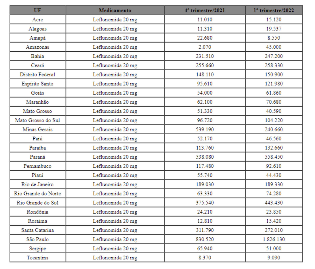 Em relação ao medicamento leflunomida encontra-se vigente o TED 40/2021, cujo quantitativo é de 20.345.130 unidades. Esse contrato tem previsão de atendimento da rede SUS até agosto de 2022, considerando o consumo médio mensal do 1º trimestre de 2022. Além disso, já há um novo processo de aquisição em andamento. Adicionalmente, é importante esclarecer que a Coordenação-Geral do Componente Especializado da Assistência Farmacêutica (CGCEAF) inicia a instrução do processo aquisitivo com 10 meses de antecedência ao fim da cobertura na Rede SUS.