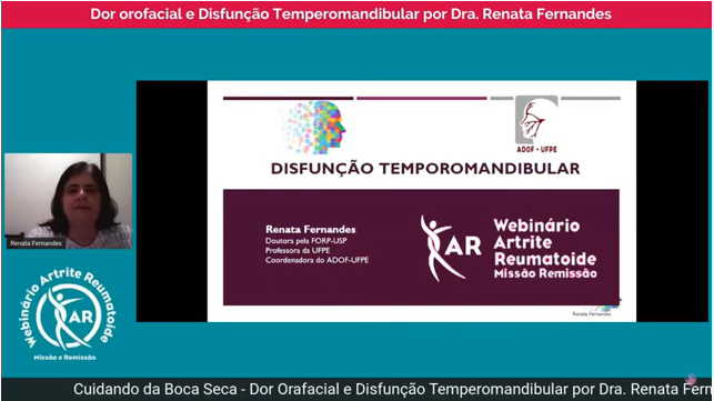 Durante o Webinário de Conscientização das Artrites, a Dra. Renata Fernandes juntou-se aos representantes das associações de pacientes responsáveis pela iniciativa do evento para falar a respeito da Dor Orofacial e da Disfunção Temporomandibular.