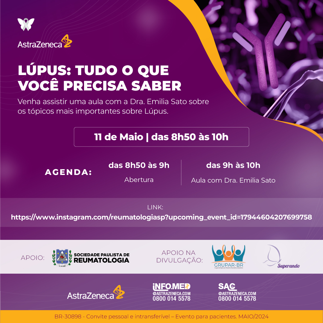 É amanhã! Participe conosco dessa super aula sobre Lúpus com a Dra. Emilia Sato. Uma oportunidade incrível de aprender mais sobre o lúpus com uma das maiores especialistas sobre o assunto.