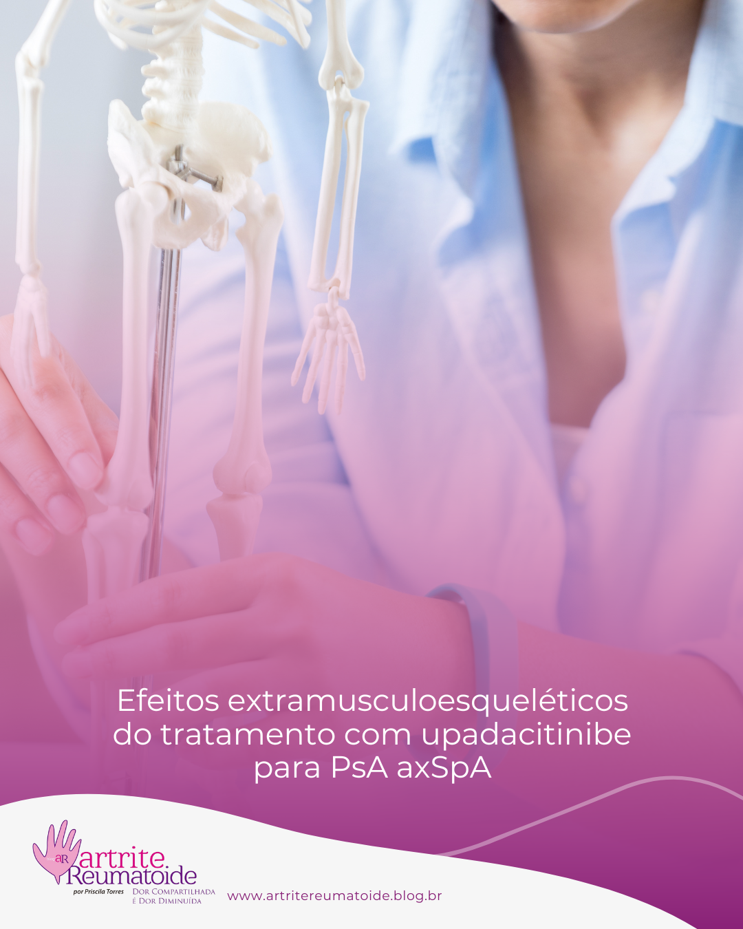 Por fim, nos pacientes com axSpA não radiográfica, as taxas de uveíte foram baixas, mas foram menos frequentes no grupo UPA (0,9 casos/100 pacientes-ano) do que no placebo (2,1 casos/100 pacientes-ano). As taxas de psoríase ou doença inflamatória intestinal foram baixas ou nulas.