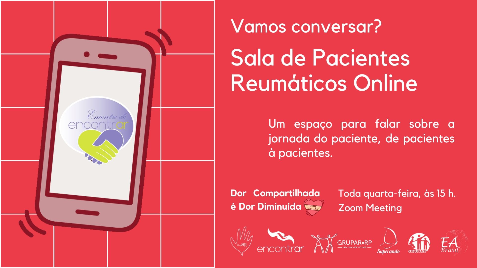 A Sala de Pacientes Online é a nova versão do Encontro do EncontrAR que seguindo a tradição, inicia os encontros de pacientes online, promovendo o compartilhamento de experiências entre pessoas que convivem com algum tipo de doença reumática.
