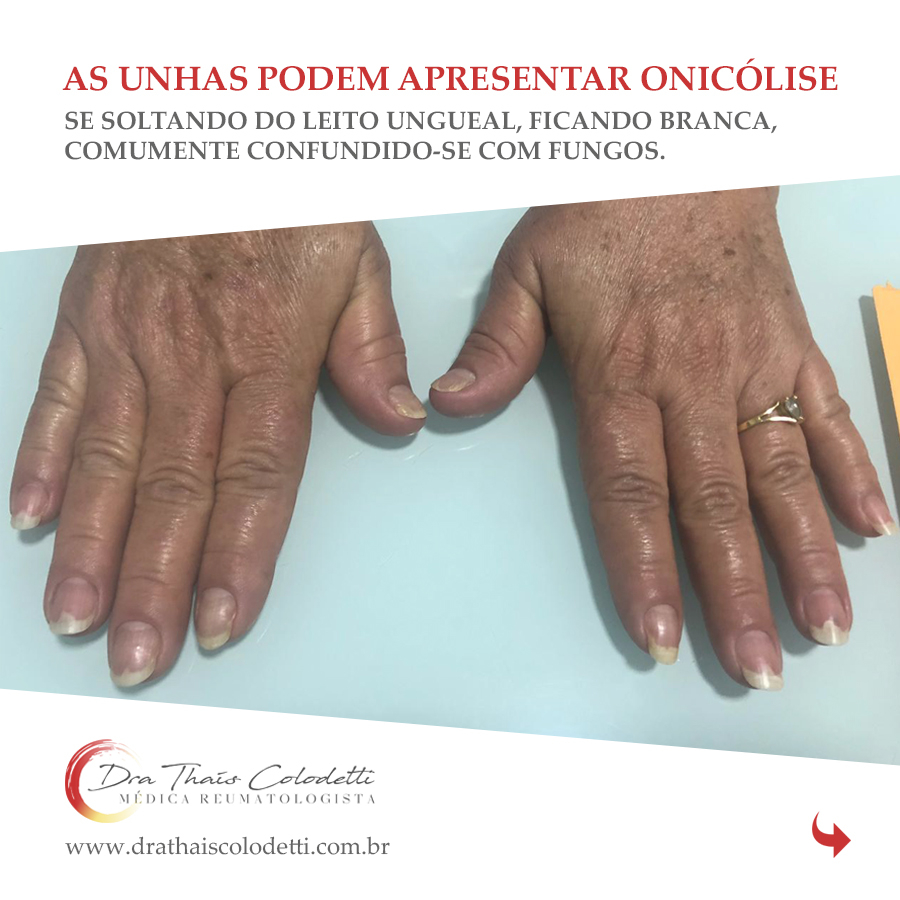 - elas podem apresentar onicólise (se soltando do leito ungueal, ficando branca, comumente confundida com fungos)⠀