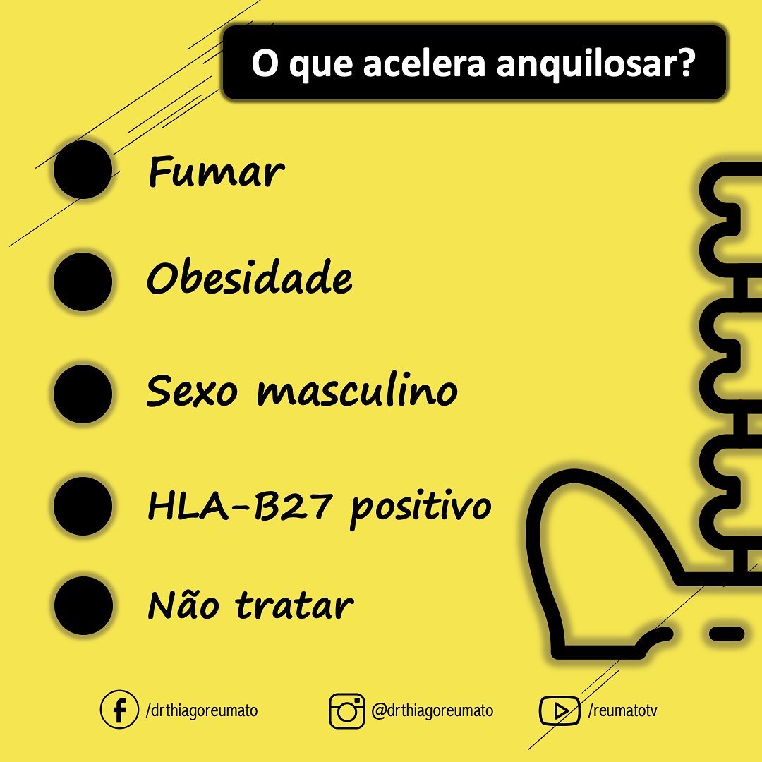Quais os pacientes que mais anquilosam? Aqueles que fumam, obesos, homens, que têm o HLA-B27 positivo e que não estão em tratamento.