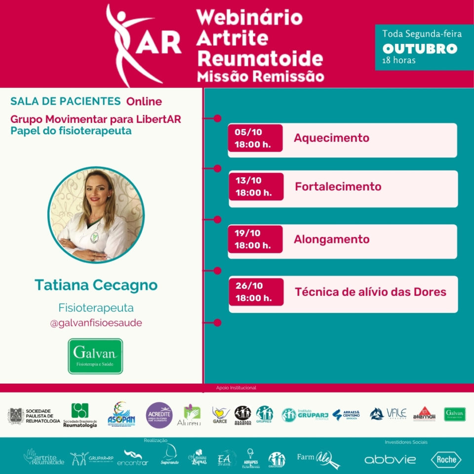 ➤ Programa MovimentAR para LibertAR Webinário sobre Artrite Reumatoide é um iniciativa da Rede Paulista de Associações de Apoio aos Pacientes Reumáticos, composta pelo Grupasp, Grupar, EncontrAR, Abrapes e Associação Brasileira Superando o Lúpus. Com apoio institucional da Acredite “ONG Amiga das Crianças com Reumatismo”, Alurel Sinos, Abrapar, Grupo Garce, Gruparj-Petrópolis, Grupaes, Escritório Arraes & Centeno, Vale Infusões e dos Blogs: Artrite Reumatoide, Espondilite Anquilosante Brasil, Farmale e A Menina e o Lúpus. Recebe o incentivo social das farmacêuticas Abbvie e Roche do Brasil.