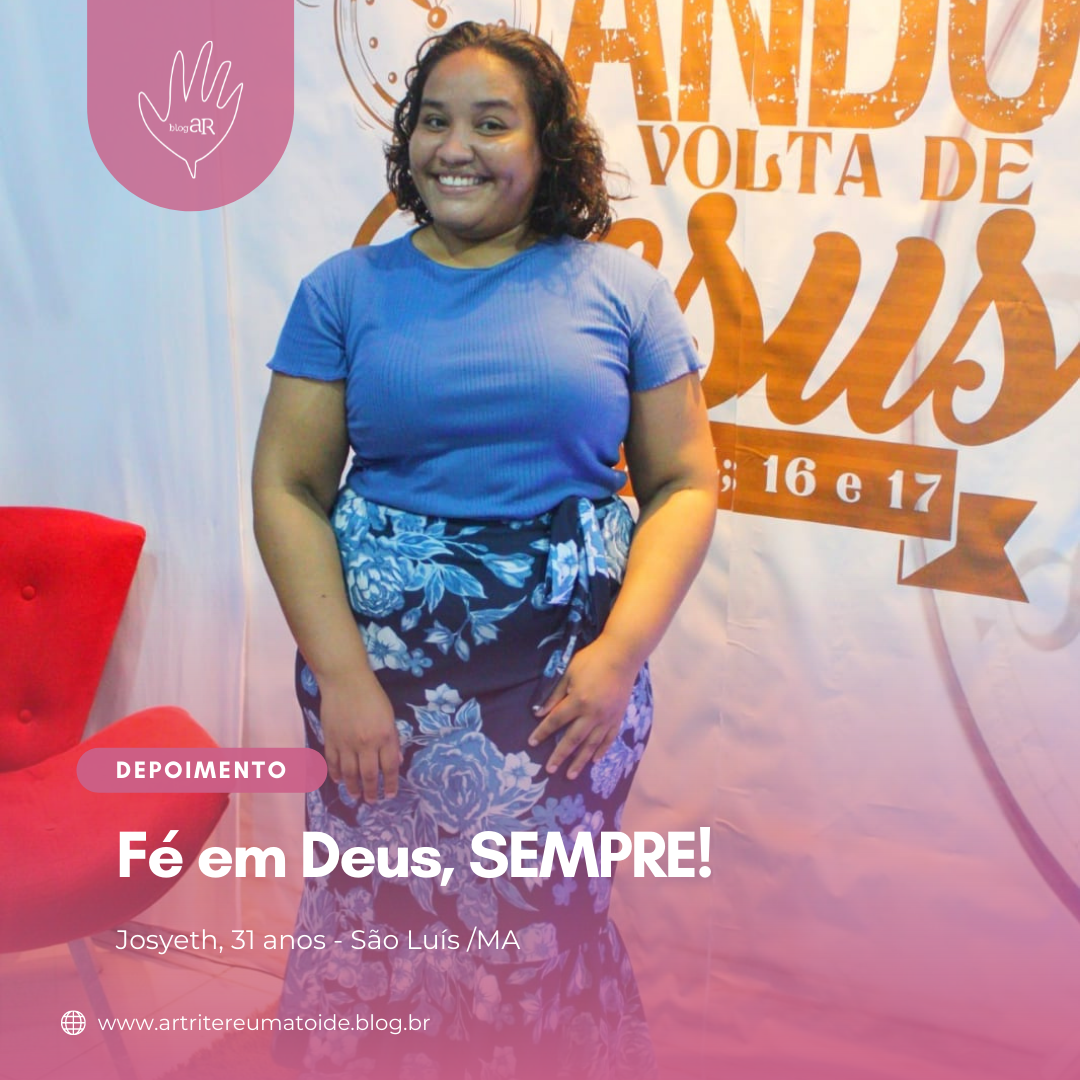 Meu nome é Josyeth, tenho 31 anos, convivo com o diagnóstico de Artrite reumatoidea poucas semanas, sou Autônoma e moro em São Luís/MA.