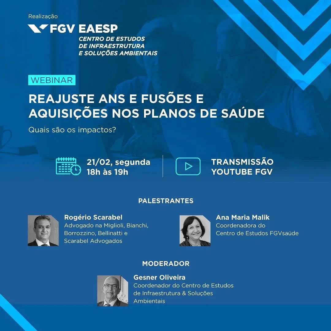 O Centro de Estudos de Infraestrutura & Soluções Ambientais da Escola de Administração de Empresas de São Paulo da Fundação Getulio Vargas realizará um webinar gratuito no dia 21 de fevereiro, às 18h, sobre reajuste ANS e fusões e aquisições nos planos de saúde. Os interessados em participar devem se inscrever pelo link: https://evento.fgv.br/reajusteans/. Após o cadastro, receberão o link do evento por e-mail.