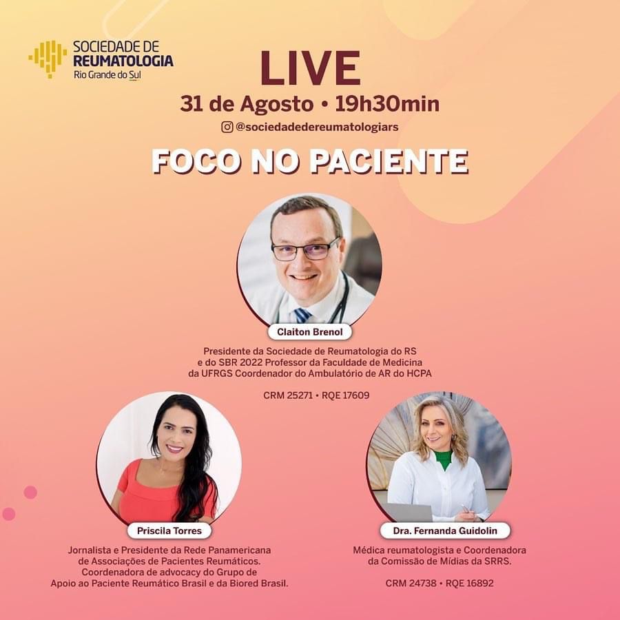 Foco no Paciente é o tema da live promovida pela Sociedade de Reumatologia do Rio Grande do Sul, que acontecerá nesta quarta-feira, dia 31 de agosto às 19:30h