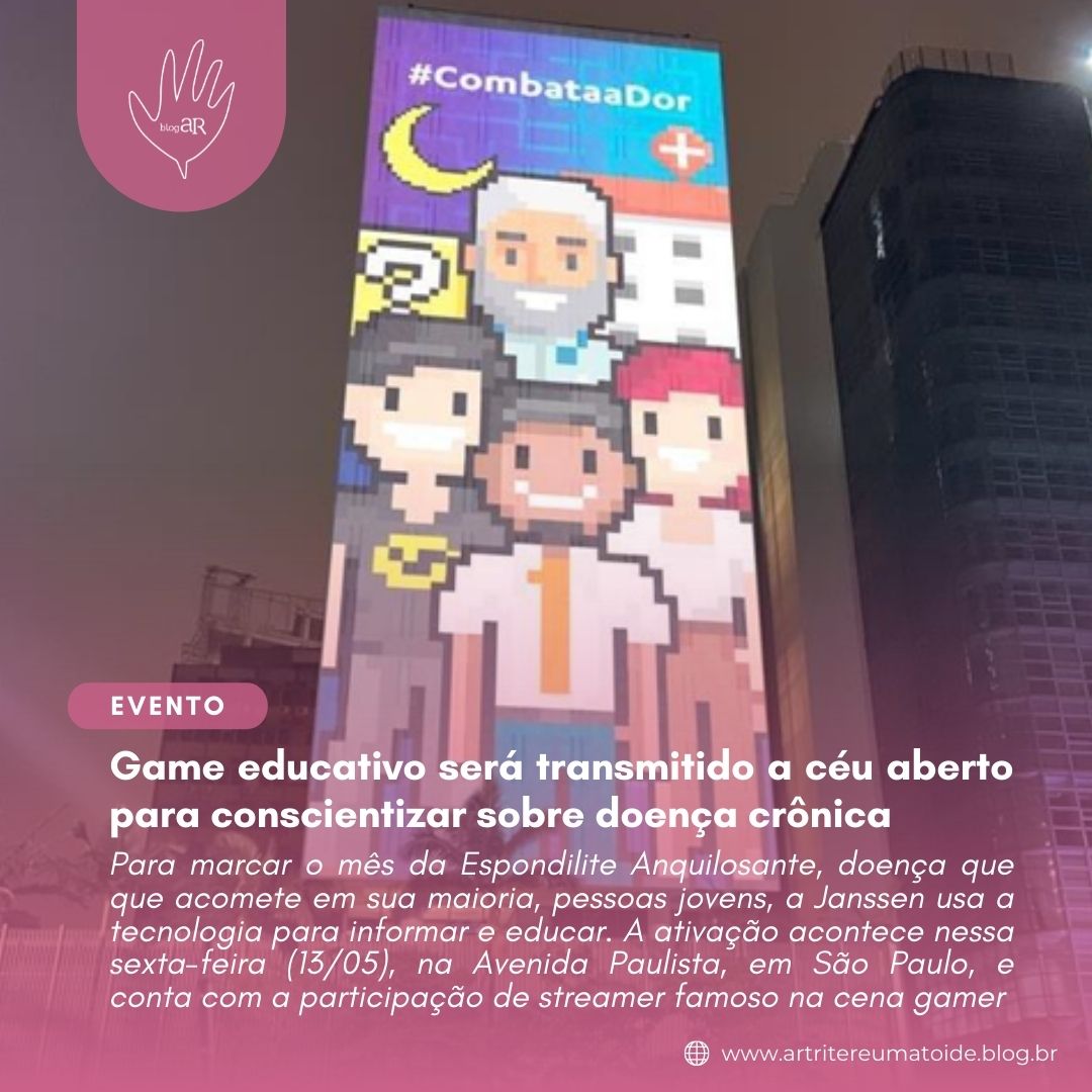 Passando para lembrar que nesta sexta-feira (13/05), a partir das 19h, um game educativo será transmitido em plena Avenida Paulista, em São Paulo. A ativação faz parte da campanha Combata a Dor: enfrente a Espondilite Anquilosante e conquiste mais movimento, promovida pela Janssen, empresa farmacêutica da Johnson&Johnson, para marcar o Dia Mundial da Conscientização da Espondilite Anquilosante (7/05). No local, o streamer Felipe Zaghetti, conhecido no universo gamer como Felps, e um paciente de Espondilite Anquilosante disputarão um jogo chamando a atenção de quem estiver passando pelo local. As pessoas interessadas também poderão participar. Vale destacar que: vamos ter um reumatologista, o Cristiano Campanholo, para atender ao público, tirar dúvidas e falar sobre a doença. E se precisar, poderá ser entrevistado também! A doença se caracteriza pela inflamação das grandes articulações da coluna e tem como principal sintoma a dor nas costas.