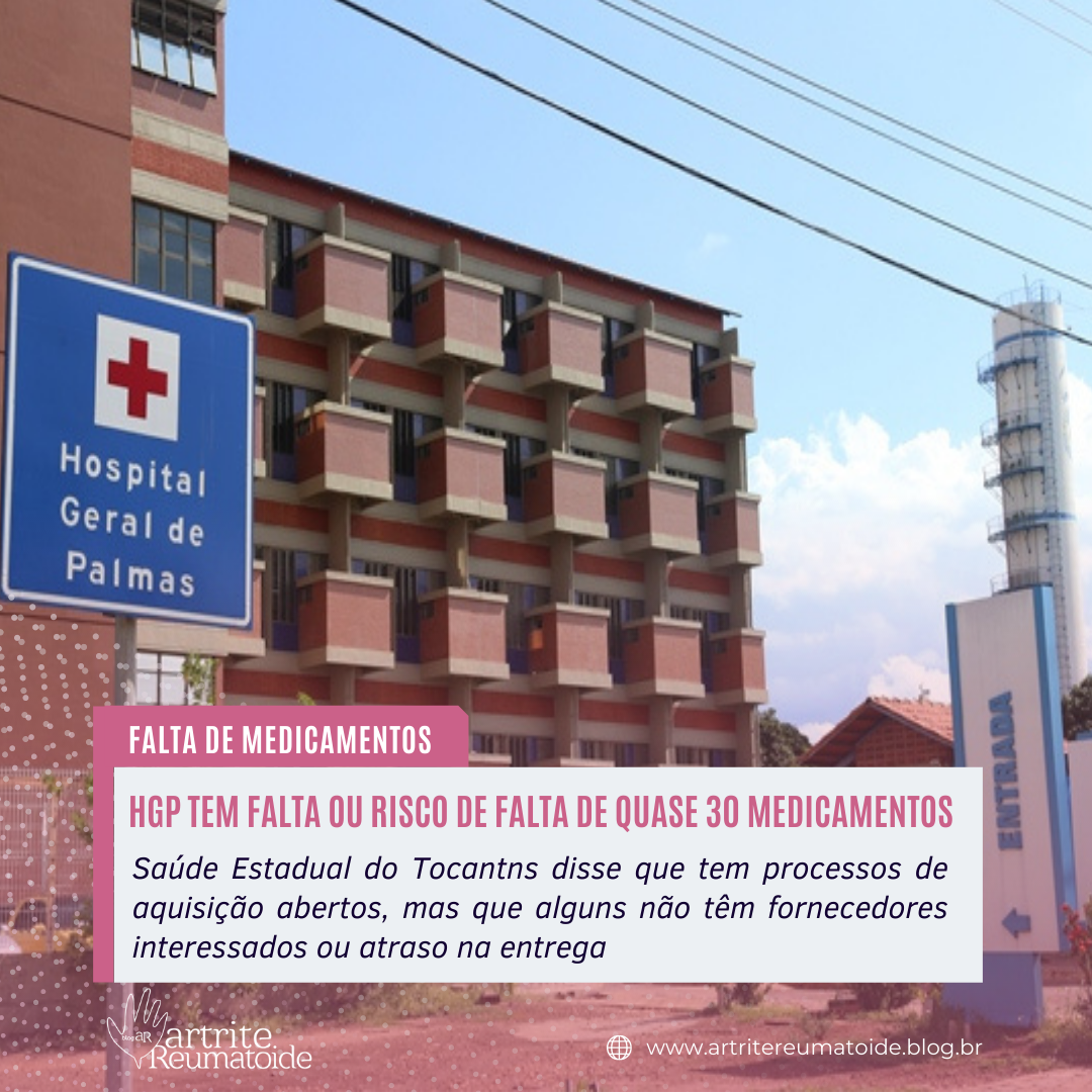 Quase 30 medicamentos estão em falta ou com risco de falta no Hospital Geral de Palmas (HGP), conforme uma denúncia recebida pelo Jornal do Tocantins. Nesta listas está em falta medicamento em comprimido, via oral ou ainda endovenosa.