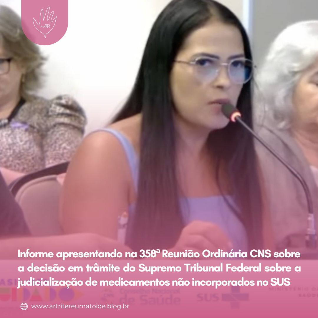 Como representante do Conselho Nacional de Saúde na comissão especial sobre judicialização de medicamentos no âmbito do SUS, a conselheira nacional de saúde, Priscila Torres apresentou na abertura da 358º Reunião Ordinária deste conselho, informe sobre a decisão em trâmite do Supremo Tribunal Federal sobre a judicialização de medicamentos não incorporados no SUS ( Recurso Extraordinário nº1366243).