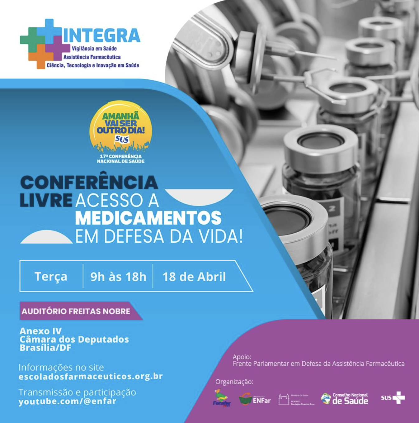 No próximo dia 18 de abril será realizada uma Conferência Livre com o tema “Acesso a Medicamentos em Defesa da Vida”. A atividade é organizada pelo Instituto Escola Nacional dos Farmacêuticos (ENFar), pela Federação Nacional dos Farmacêuticos (Fenafar) e pela Fundação Oswaldo Cruz (Fiocruz), organizadores do Projeto Integra, e pela Frente Parlamentar em Defesa da Assistência Farmacêutica.