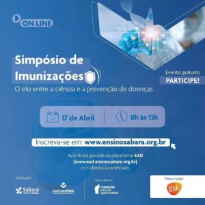 Com o objetivo de atualização de profissionais da área da saúde infantil e com ênfase em pediatras, imunologistas, infectologistas e alergologistas, o INSTITUTO PENSI promove o Simpósio de Imunizações: o elo entre a ciência e a prevenção de doenças. Fazendo referência especial ao Covid-19, o evento será realizado no dia 17/04/2021, sábado, das 08h00 às 13h00, de forma online e gratuita. Para realizar a inscrição, basta acessar o site Ensino Sabará (https://ensinosabara.org.br/). Os participantes terão direito a emissão do certificado e as aulas ficarão gravadas em nosso site EAD (https://www.ead.ensinosabara.org.br).