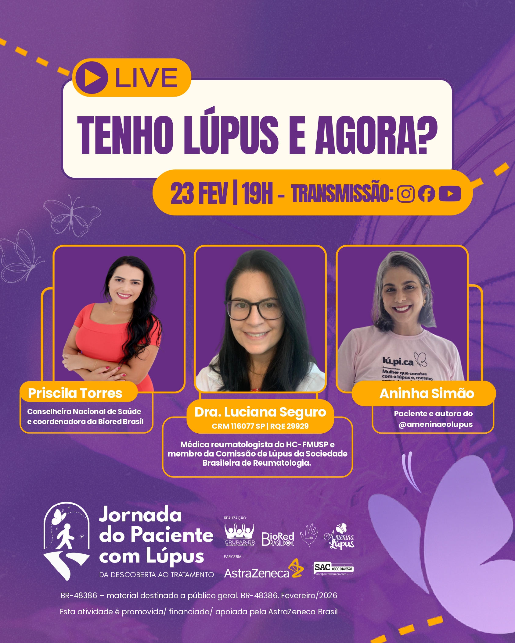 A live contará com a participação da reumatologista Dra. Luciana Seguro, do Hospital das Clínicas da Faculdade de Medicina da USP (HC-FMUSP) e integrante da Comissão de Lúpus da Sociedade Brasileira de Reumatologia, além de Ana Geórgia Simão, criadora do perfil @ameninaeolupus, que compartilhará sua experiência com a doença.
