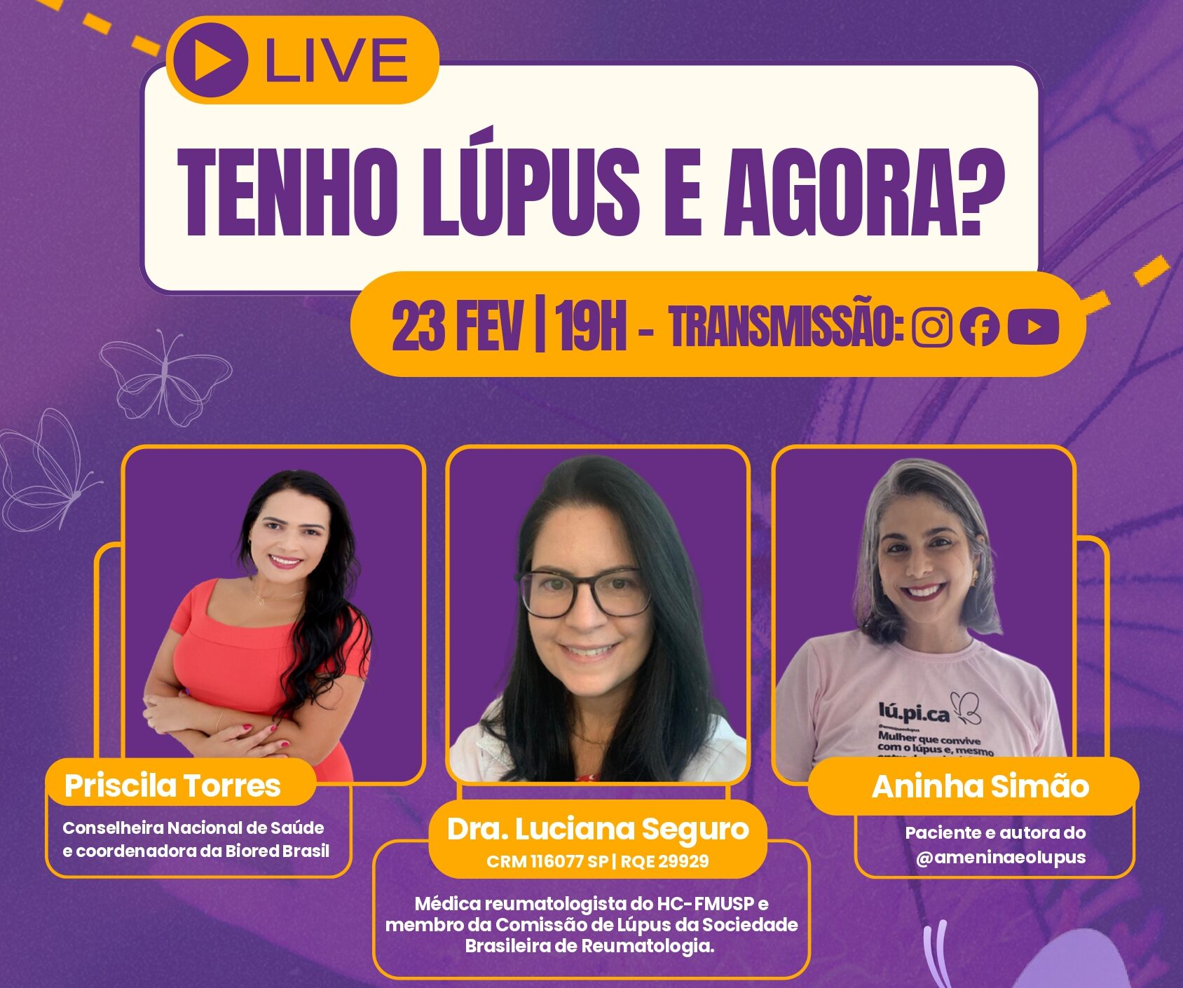 A live contará com a participação da reumatologista Dra. Luciana Seguro, do Hospital das Clínicas da Faculdade de Medicina da USP (HC-FMUSP) e integrante da Comissão de Lúpus da Sociedade Brasileira de Reumatologia, além de Ana Geórgia Simão, criadora do perfil @ameninaeolupus, que compartilhará sua experiência com a doença.
