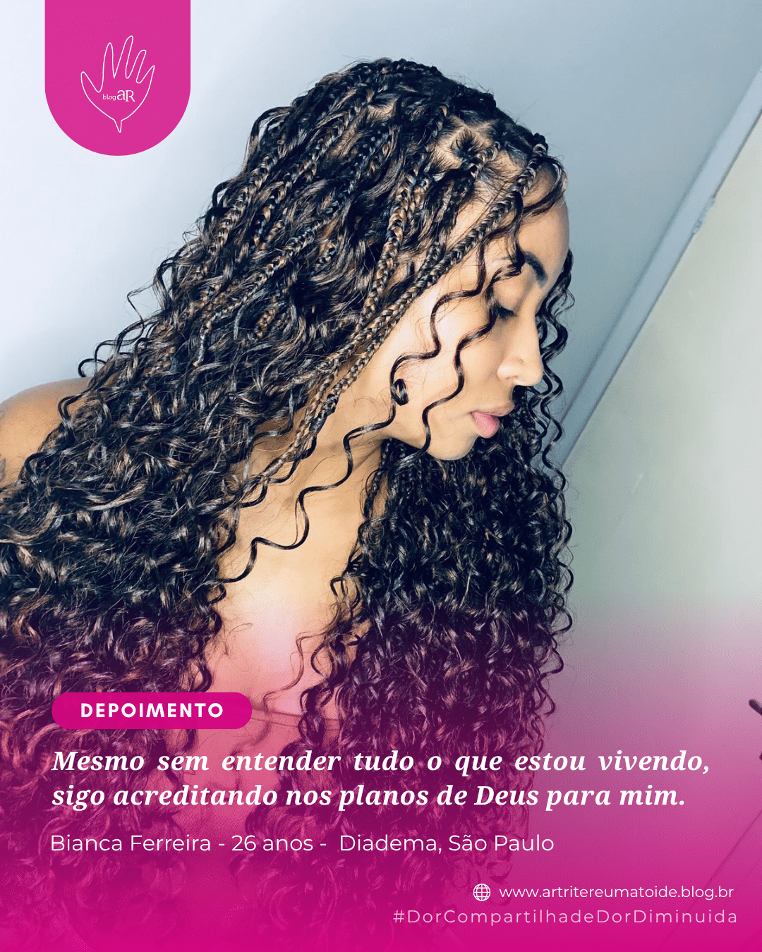 Meu nome é Bianca Ferreira @biaspfc, tenho 30 anos, convivo com o diagnóstico de artrite reumatoide, fibromialgia e fibrose pulmonar há 2 anos, sou auxiliar de enfermagem e moro em Diadema, São Paulo