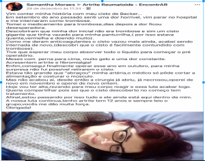 Afinal, estou passando por tudo isso e ele ainda está aqui dentro de mim. A nossa luta continua, tenho artrite há 12 anos e sempre leio o grupo, vocês me dão muita força.