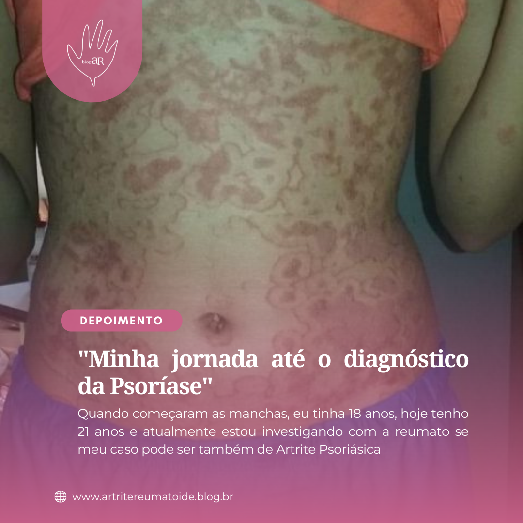 Quando começou as manchas tinha 18 anos, hoje tenho 21 anos, já tem 1 ano meio que não tomo medicação pra psoríase, porém comecei sentir dor nas articulações assim que suspendemos o uso do medicamento, hoje em dia estou em acompanhamento com a reumatologista pra chegar em um diagnóstico sobre essas crises de dores.