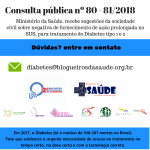 Após a incorporação das insulinas de ação rápida ano passado no SUS, agora a Comissão Nacional de Incorporação de Tecnologia no SUS (CONITEC) abre consulta pública para avaliação dos análogos de ação lenta tanto para pacientes com diabetes tipo 1 como para pacientes com diabetes tipo 2. As consultas públicas nº 80- 81/2018 avaliam a incorporação das insulinas glargina, detemir e degludeca. Até 17 de janeiro, pacientes, profissionais da saúde e demais interessados em participar poderão enviar suas contribuições para o órgão por meio de um formulário online.