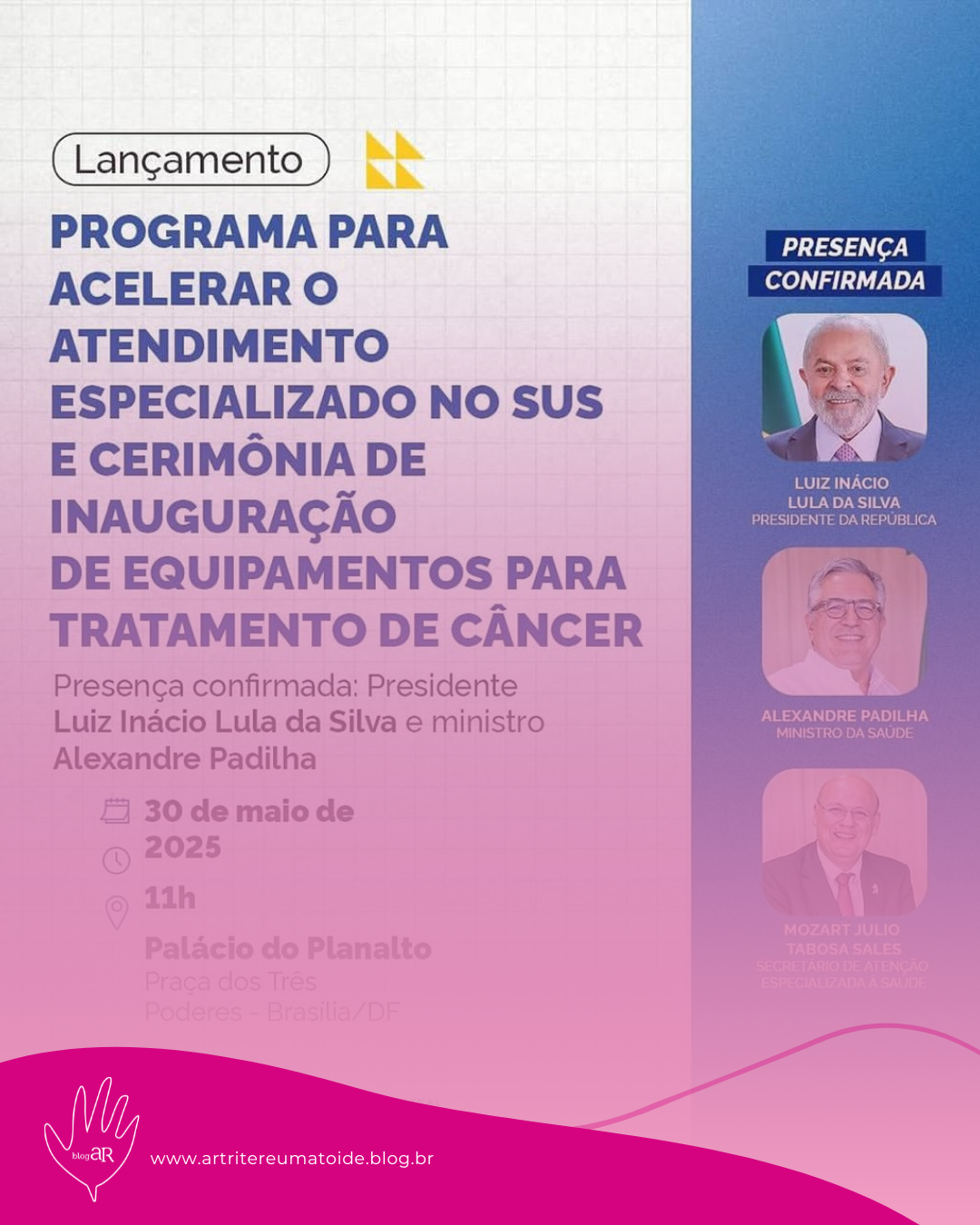 Ministério da Saúde, realizará nesta sexta-feira, dia 30 de maio às 11 horas, o lançamento de um novo Programa para zerar o tempo de espera do Atendimento Especializado no SUS, que incluí desde consulta com médico especialista até exames e procedimentos especializados. Confira as cidades que recebem o evento de inauguração: