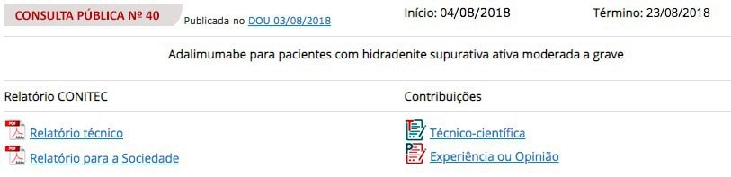 Esta aberta até o dia 23 de agosto a consulta pública nº 40 da Conitec, para incorporar o tratamento da hidradenite supurativa no SUS. O Ministério da Saúde propõe fornecer nas farmácias de alto custo, o medicamento adalimumabe, um tratamento inovador que controla a doença e permite a recuperação da qualidade de vida.