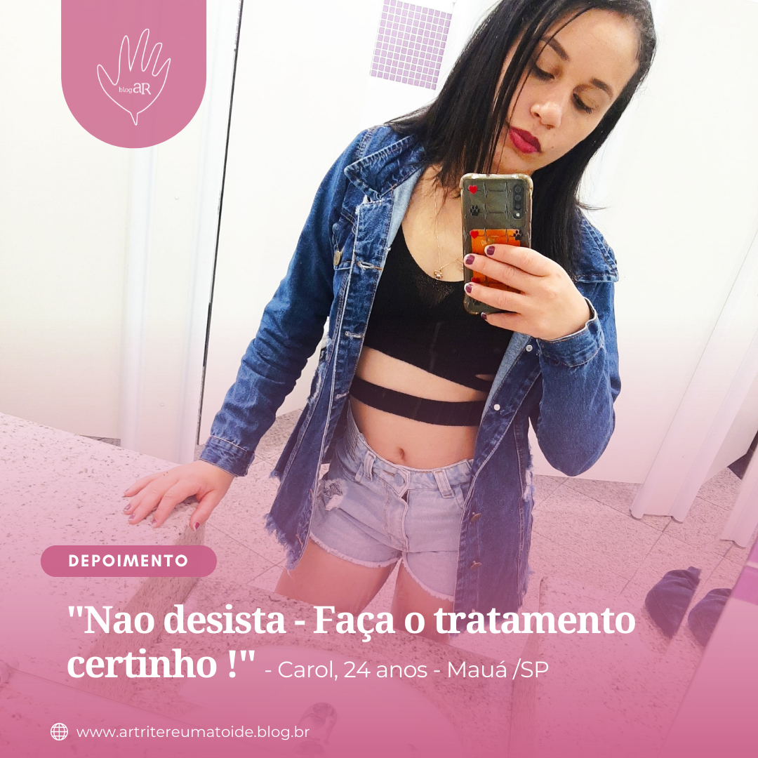 Meu nome é Carol, tenho 24 anos, convivo com o diagnóstico de Artrite Reumatoide há 12 anos, sou Operadora de Caixa, e moro em Mauá/SP.