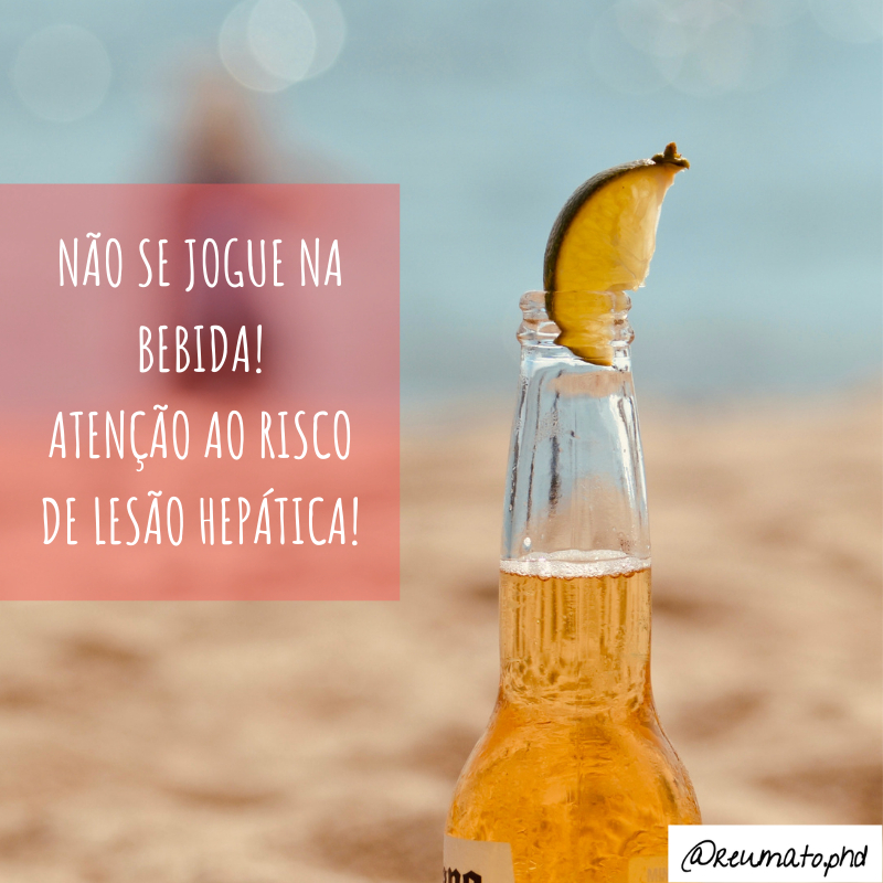 Não se jogue no álcool! Muito cuidado com o excesso! Pacientes que fazem uso de anti-inflamatórios e outras medicações como o metotrexato precisam ficar atentos ao risco de lesões hepáticas.⠀