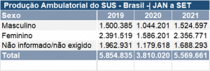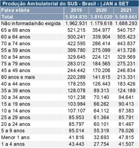 Em 2019, de janeiro a setembro, foram realizados, em média, cerca de 650,5 mil exames desses quatro tipos a cada mês. No ano seguinte, quando foi decretada a pandemia, esse total baixou para 423,3 mil mensais. Em 2021, com o início da retomada da normalidade nas atividades assistenciais, a média subiu para 618,8 mil procedimentos, número ainda inferior ao de dois anos atrás.