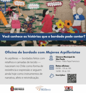 Entre os dias 5 e 20 de agosto, a Câmara Municipal de São Paulo abre espaço para a arte e a memória com a exposição “Bordando Histórias”, uma iniciativa do coletivo Mujeres Arpilleristas, com apoio do Consulado do Chile.