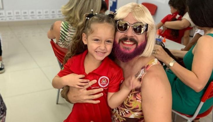 Daniel então pediu ajuda à irmã, usou um vestido de sua mãe, salto alto, passou batom, pintou a barba, colocou a peruca loira e chegou à homenagem na escola surpreendendo a todos, em especial a pequena Luna.